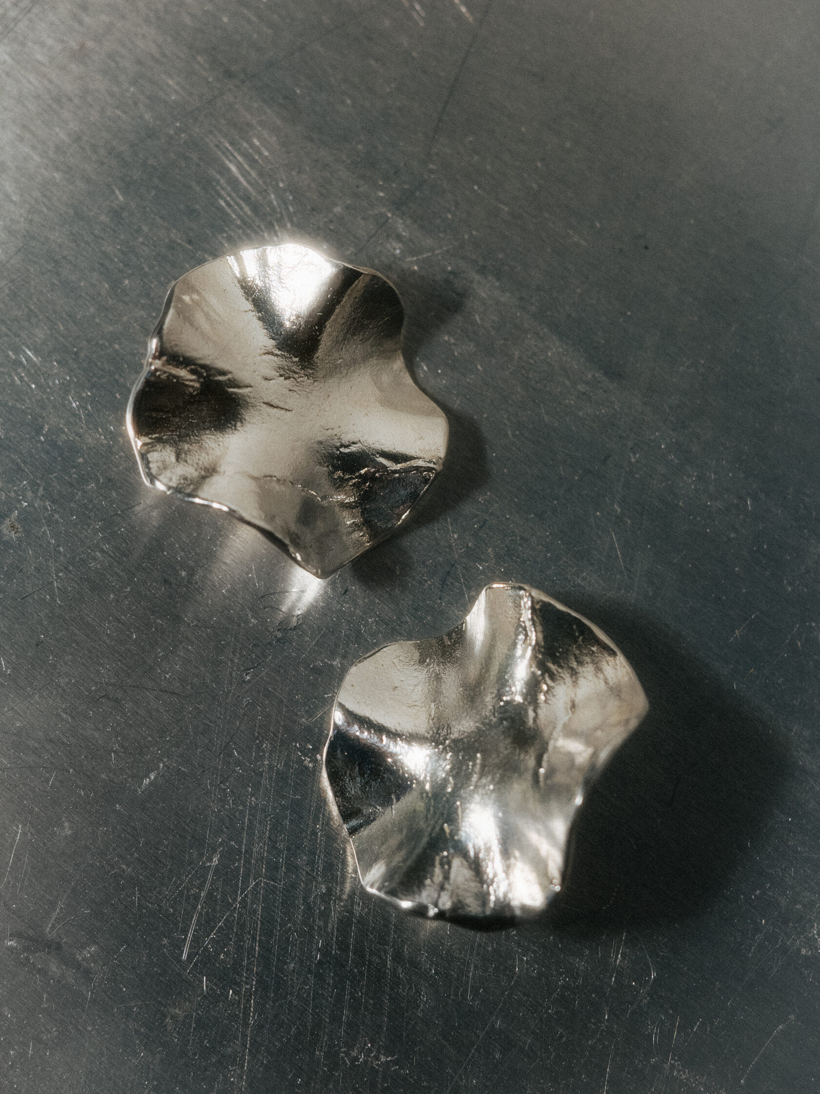 Круглые асимметричные серьги-пусеты из серебра с мягко-неровной фактурой. Плавные изгибы серег красиво отражают свет, создавая игру бликов и мягких теней. Это свечение делает украшение визуально живым и притягательным, добавляя эффектный акцент даже к самым лаконичным образам.